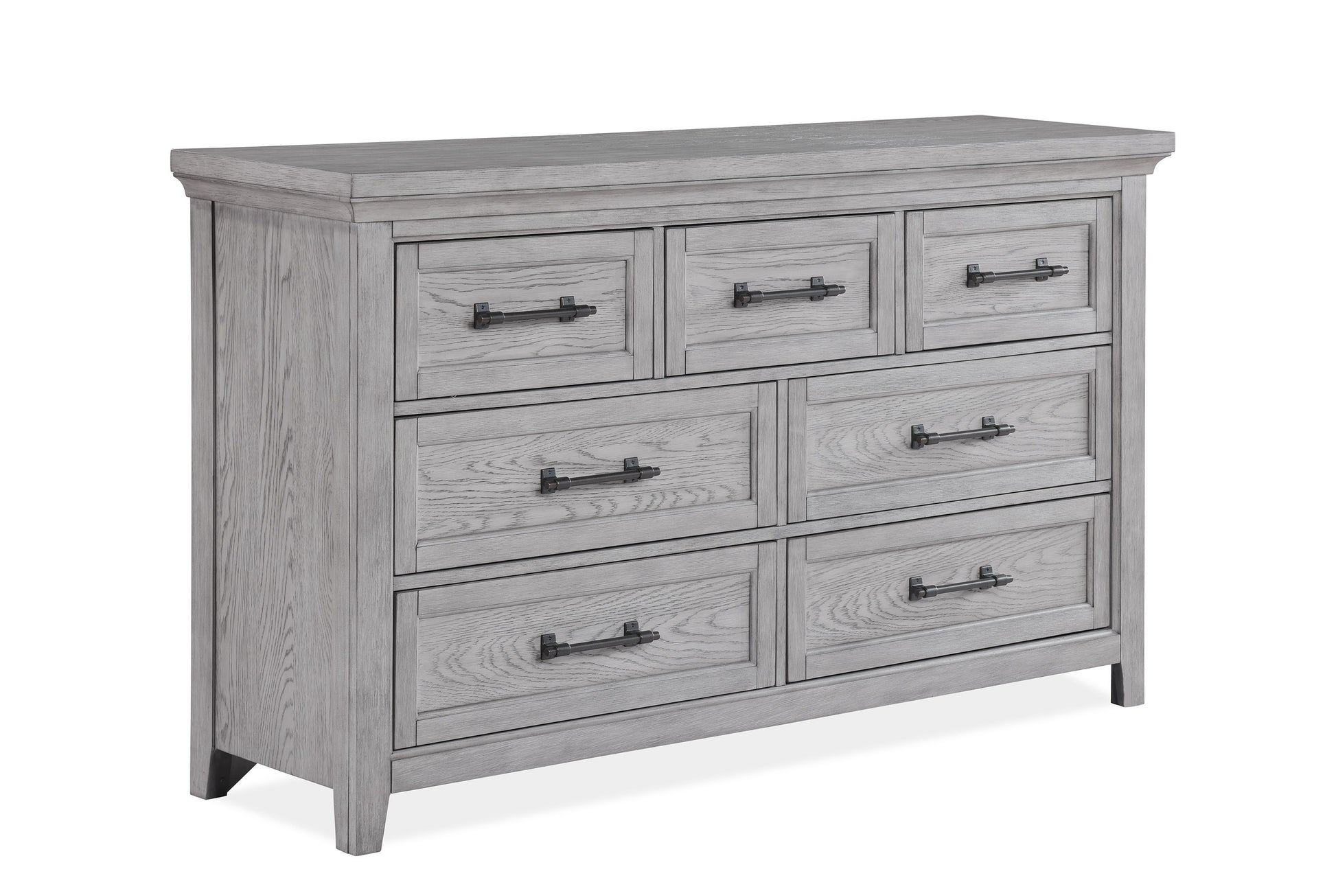 This bedroom suite offers a refreshing take on rustic charm, featuring a soft finish that highlights the natural wood grain. The sturdy bed stands as the centerpiece with its robust headboard and inviting design, while the accompanying pieces — a nightstand, dresser, and chest — provide ample storage, each fitted with understated hardware that accentuates the collection's country-inspired look.