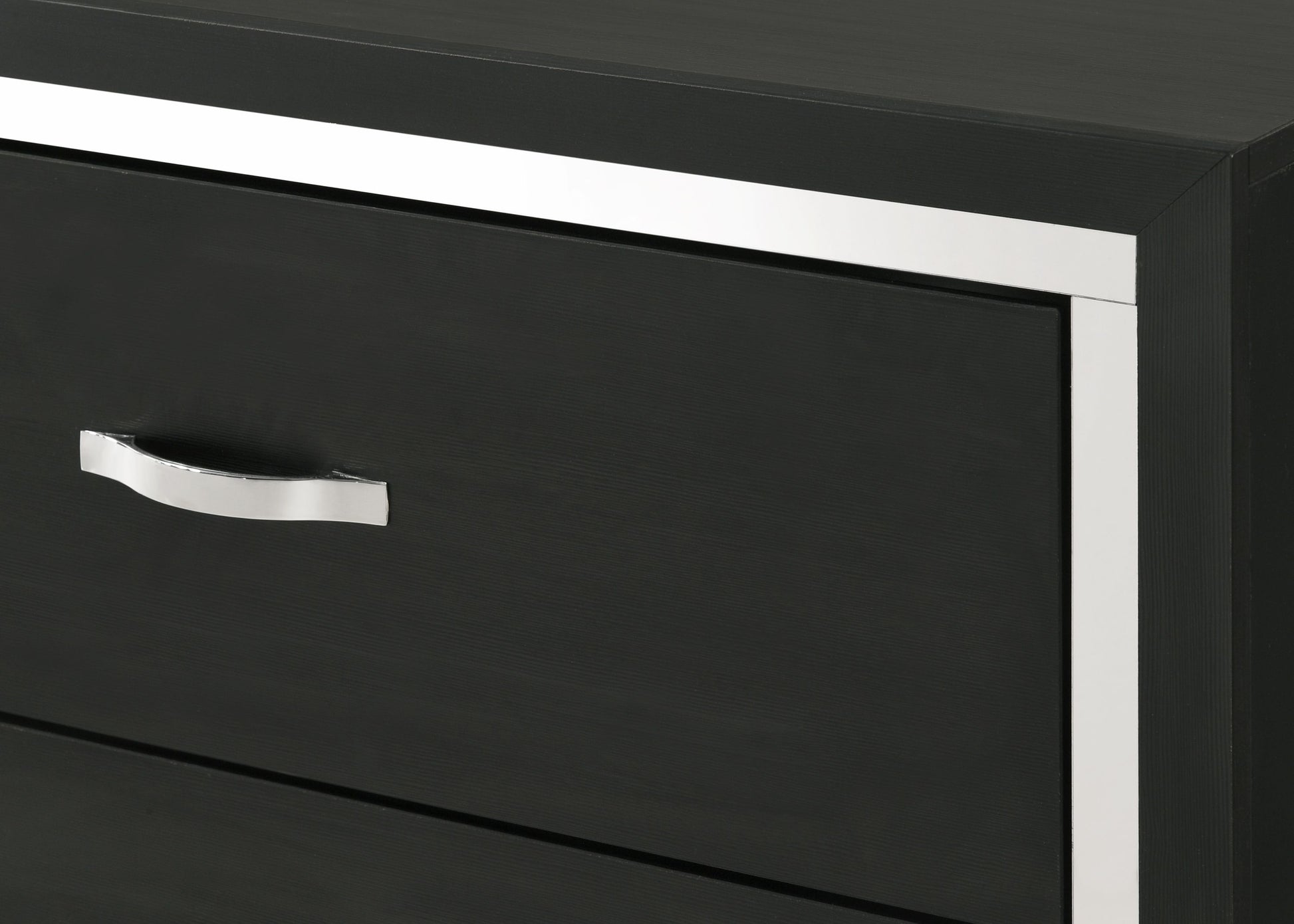This bedroom collection strikes a balance between bold and classic styles. It features a striking bed with a high, channel tufted headboard that commands attention. The accompanying case goods, including a dresser with a mirror, chest, and nightstand, are all finished in a sharp, black hue that adds depth and modernity to any bedroom. Each piece is accented with sleek metal handles that contrast beautifully against the dark finish. The clean lines and uncluttered design of the furniture allow for versatile placement in a variety of interior styles, from contemporary to transitional.