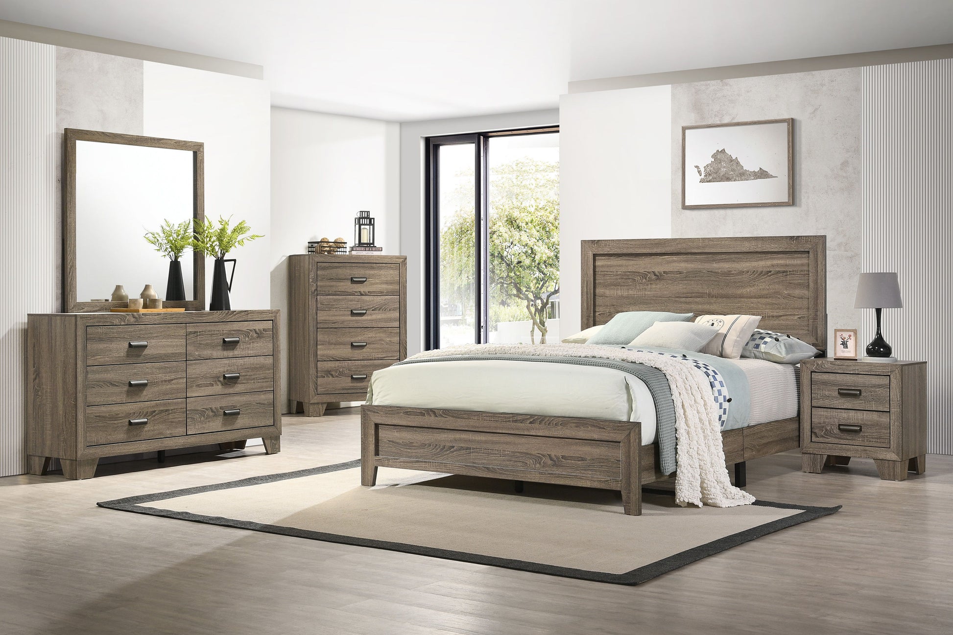 This bedroom set offers a minimalist design with a nod to rustic aesthetics, perfect for creating a serene and uncluttered space. The straightforward lines of the bed frame, combined with the wood finish, exude a sense of calm and earthiness. The accompanying pieces, including a simple dresser with a matching mirror, a functional chest, and a streamlined nightstand, are all characterized by their clean profiles and understated hardware. This collection is designed for practicality and durability, with ample storage options that cater to a hassle-free, organized lifestyle.